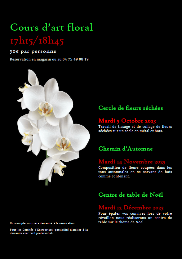 De nombreux clients ont souhaité apprendre les techniques d’art floral afin de composer eux-mêmes leur création floral. l'Orchidée Sauvage a donc décidé de proposer des cours d’art floral, individuels ou en groupe, pour les personnes intéressées. Prenez contact avec nous pour plus de détails !